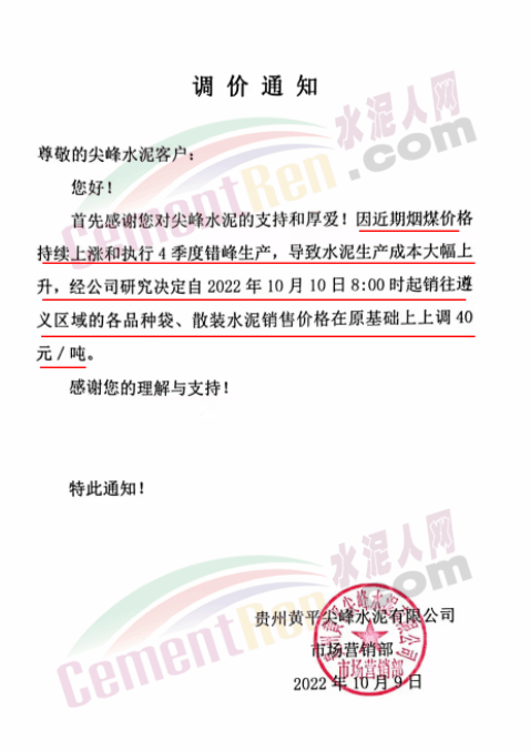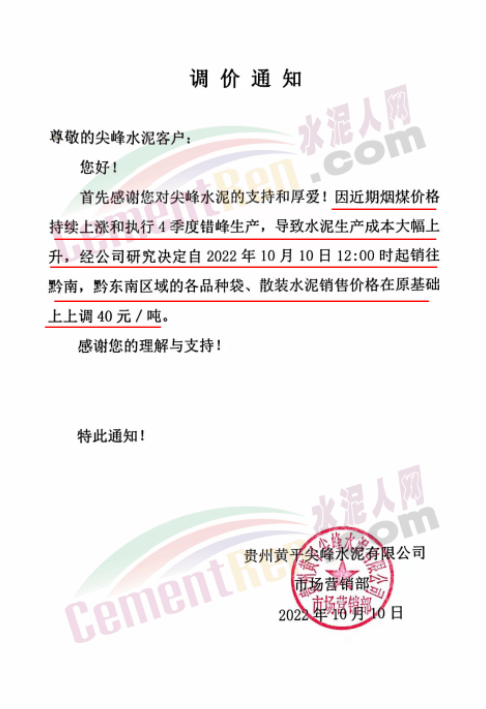 貴州黃平尖峰水泥通知,因近期煙煤價格持續(xù)上漲和執(zhí)行4季度錯峰生產,導致水泥生產成本大幅上升,經公司研究決定自10月10日起銷往黔南、黔東南以及遵義區(qū)域的各品種水泥價格上調40元/噸。