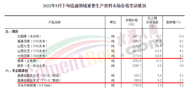 10月9日,國家統(tǒng)計局公布了2022年9月下旬流通領域重要生產資料市場價格變動情況,水泥人網(wǎng)注意到流通領域煤炭價格仍處于上行趨勢,各類型煤炭報價仍處于1000元/噸以上,其中5800大卡山西大同混煤報價1573.6元/噸,較上期上漲118.6元/噸;同比上年同期報價1289.1元/噸,上漲284.5元/噸。同期P.O42.5散裝水泥報價389.8元/噸,上漲8.2元/噸,漲幅2.1%,仍未突破400元/噸大關;同比上年同期547.8元/噸報價下跌158元/噸。