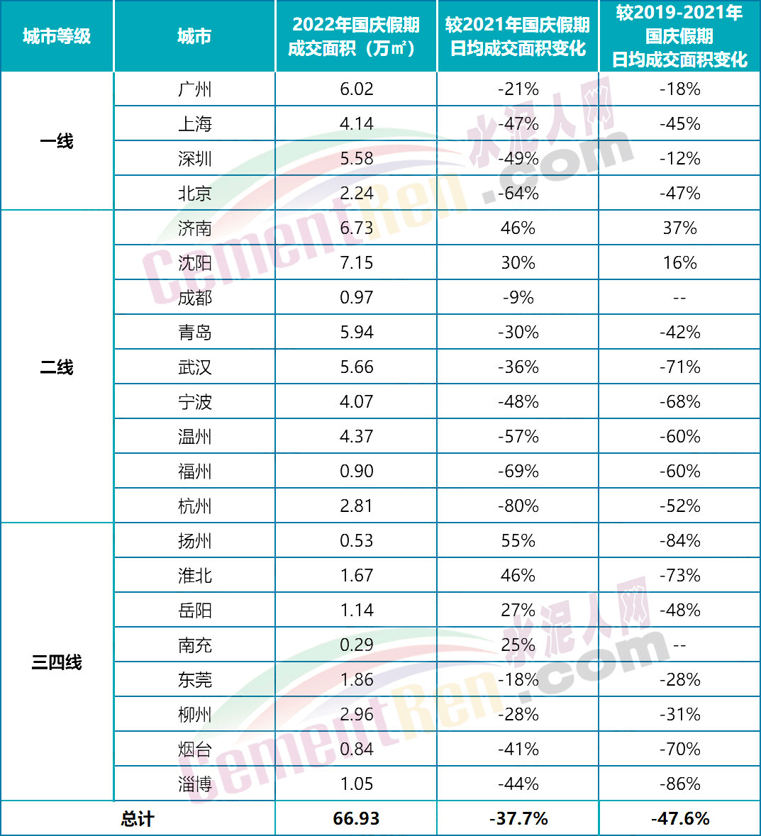 注:北京2021年國慶假期成交數(shù)據(jù)剔除恒大兩個集中網(wǎng)簽項目;總計中較2019-2021年國慶假期日均成交面積變化不含成都、南充