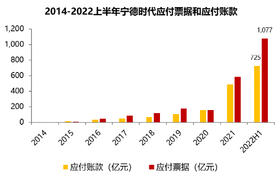 面對營業(yè)成本的快速上升和不斷擴大的產(chǎn)能,寧德時代資金支付需求快速上升。企業(yè)對供應(yīng)商的欠款一般在資產(chǎn)負債表中計入應(yīng)付賬款和應(yīng)付票據(jù)項目中,寧德時代2012-2022上半年應(yīng)付賬款和應(yīng)付票據(jù)變化情況如下: