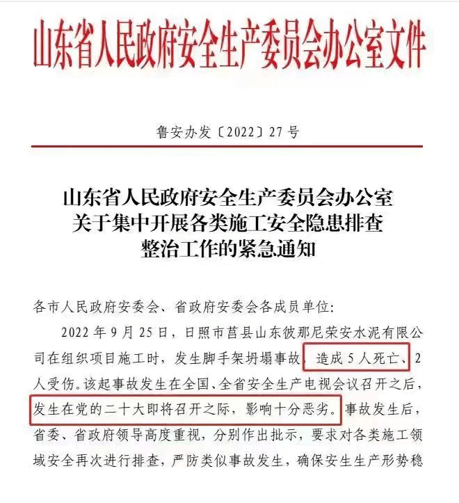 2022年9月25日,日照市莒縣山東彼那尼榮安水泥有限公司在組織項(xiàng)目施工時(shí),發(fā)生腳手架坍塌事故,造成5人死亡、 2人受傷。該起事故發(fā)生在全國、全省安全生產(chǎn)電視會(huì)議召開之后,影響十分惡劣。