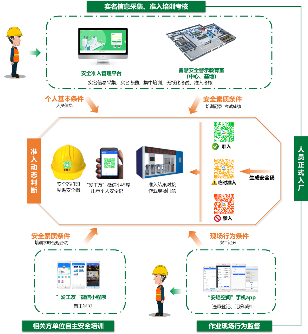 水泥企業(yè)相關(guān)方人員安全準(zhǔn)入管理解決方案 ,以相關(guān)方人員“個(gè)人基本條件+安全素質(zhì)條件+現(xiàn)場(chǎng)行為條件”為依據(jù),綜合研判相關(guān)方人員準(zhǔn)入狀態(tài),生成安全碼,人因風(fēng)險(xiǎn)等級(jí)可視化。同時(shí)通過智慧安全警示教育室、安全準(zhǔn)入管理平臺(tái)、“愛工友”微信小程序等用于人員信息采集、準(zhǔn)入培訓(xùn)考核、作業(yè)行為監(jiān)督,嚴(yán)控相關(guān)方人員安全準(zhǔn)入,降低人因安全風(fēng)險(xiǎn),減少安全事故的發(fā)生。