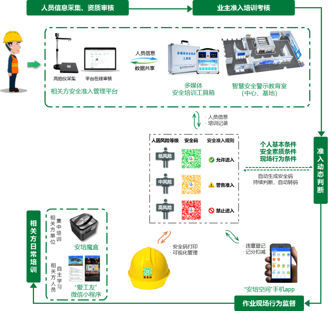 水泥企業(yè)相關(guān)方安全準入管理,通過對相關(guān)方人員個人基本條件、安全素質(zhì)條件和現(xiàn)場行為條件綜合研判,自動判斷人員準入狀態(tài),生成安全碼,并標識紅、黃、綠三種顏色,人因風(fēng)險等級可視化。