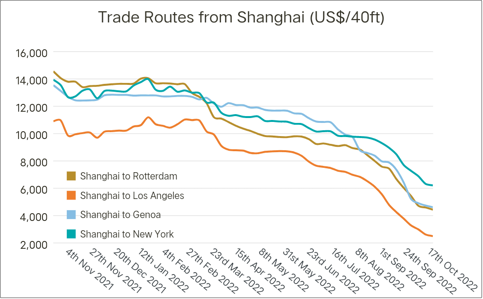 國際航運市場,從去年的一船難求到如今的無人問津可見一斑,近日,上海至洛杉磯集裝箱指數(shù)正在斷崖式下跌;上海發(fā)往歐洲路特丹港的集裝箱指數(shù)也在急劇下跌;上海發(fā)往意大利熱那亞的集裝箱指數(shù)也難以幸免。這三個數(shù)據(jù)很明確的說明中國在太平洋、印度洋和大西洋的航運指數(shù)正在急劇下降。
