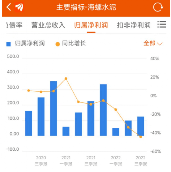 從各報告期來看,自2021年半年報開始,海螺水泥各期內(nèi)的盈利水平同比都呈現(xiàn)負增長。2022年至今,各期凈利潤同比仍是負增長,且降幅進一步擴大。