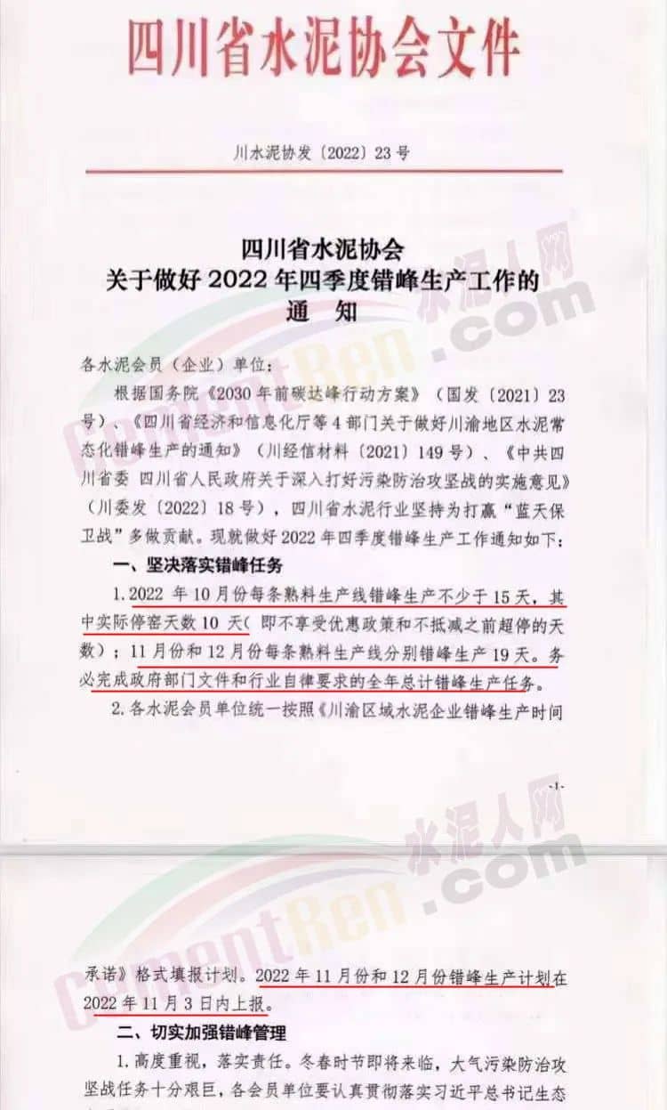 日前,四川省水泥協(xié)會發(fā)布《關(guān)于做好2022年四季度錯峰生產(chǎn)工作的通知》提到10月份每條熟料生產(chǎn)線錯峰生產(chǎn)不少于15天,其中實(shí)際停窯天數(shù)10天。(即不享受優(yōu)惠政策和不抵減之前超停的天數(shù));11月份和12月份每條熟料生產(chǎn)線分別錯峰生產(chǎn)19天。務(wù)必完成政府部門文件和行業(yè)自律要求的全年總計錯峰生產(chǎn)任務(wù)。
