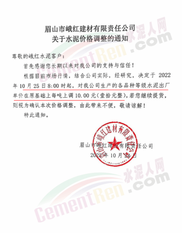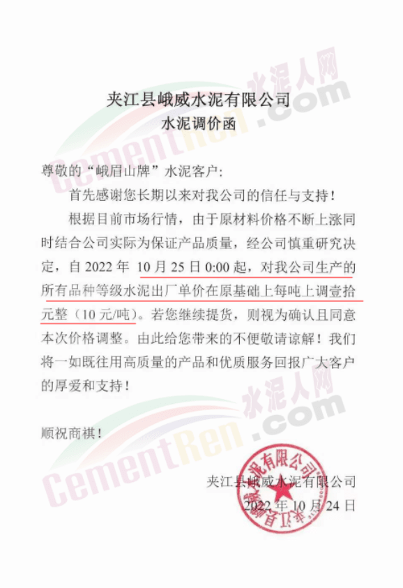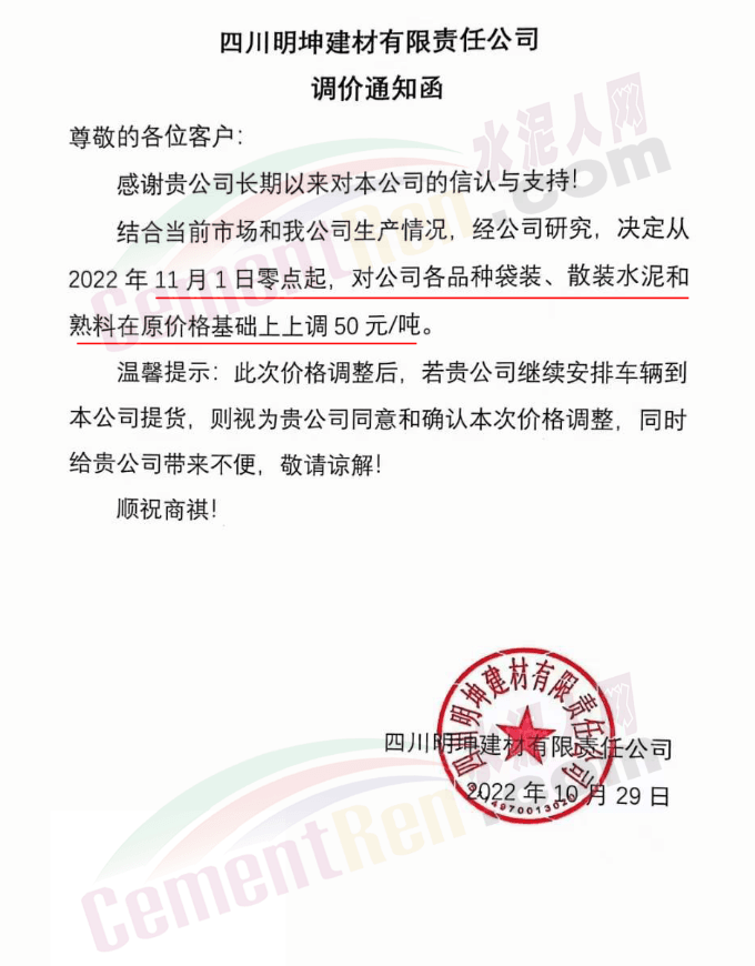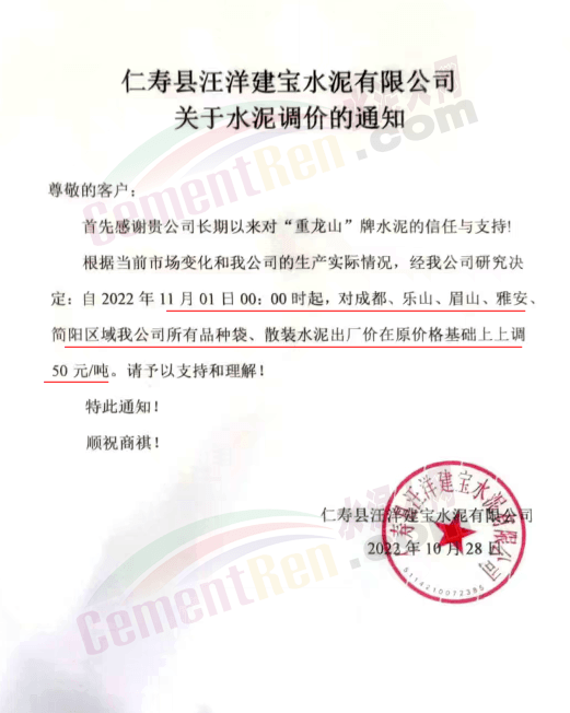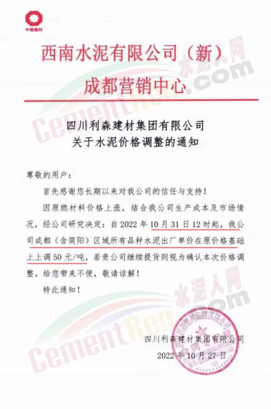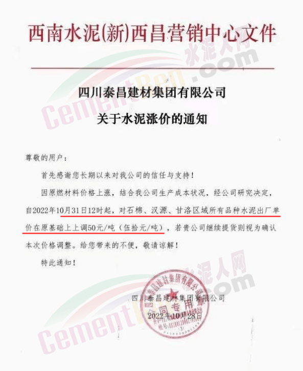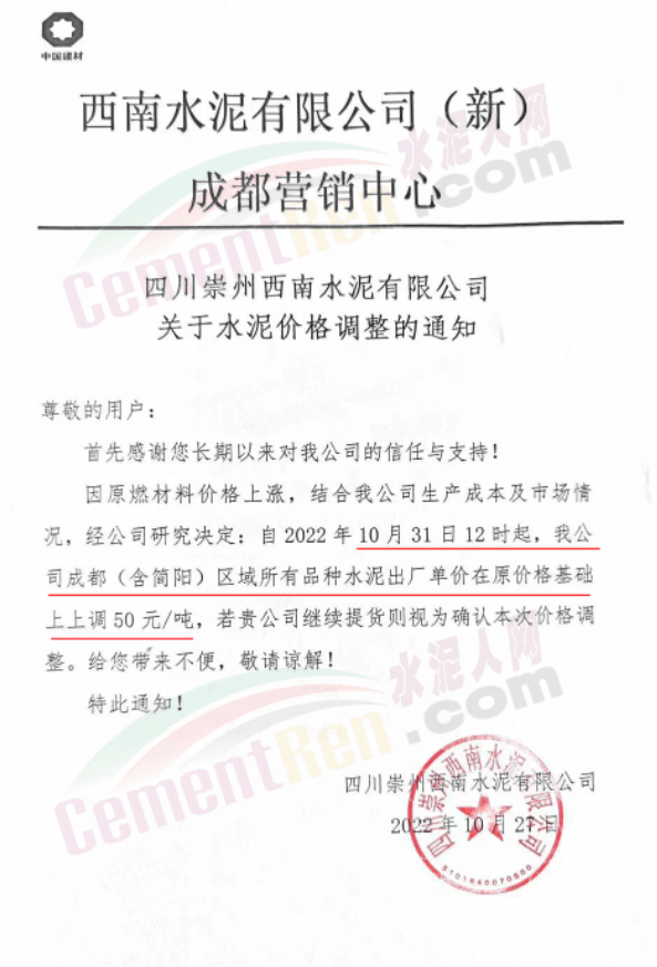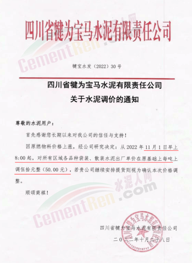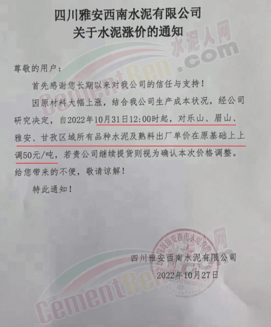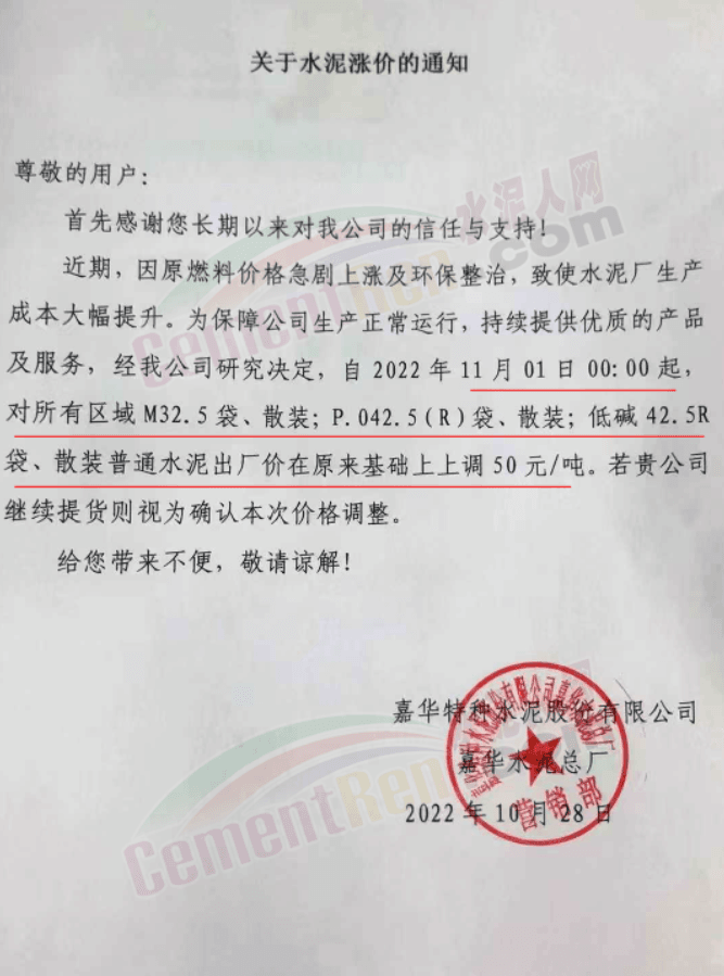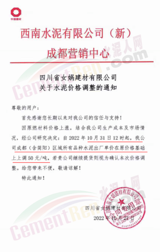 據(jù)了解,本輪調(diào)價是從10月30日起,包括粉磨站在內(nèi)的多家水泥企業(yè)通知上調(diào)水泥價格50元/噸,熟料價格同步上調(diào)30元/噸。