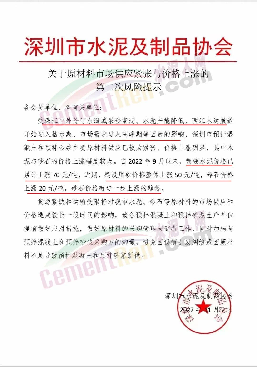 11月2日深圳市水泥及制品協(xié)會(huì)發(fā)布《關(guān)于原材料市場(chǎng)供應(yīng)緊張與價(jià)格上漲的第二次風(fēng)險(xiǎn)提示》稱,受采砂期滿、水泥產(chǎn)能降低、西江水運(yùn)航道開(kāi)始進(jìn)入枯水期、市場(chǎng)需求進(jìn)入高峰期以及水泥、砂石報(bào)價(jià)上漲等因素的影響,珠三角區(qū)域局部市場(chǎng)出現(xiàn)材料供應(yīng)緊張情況。