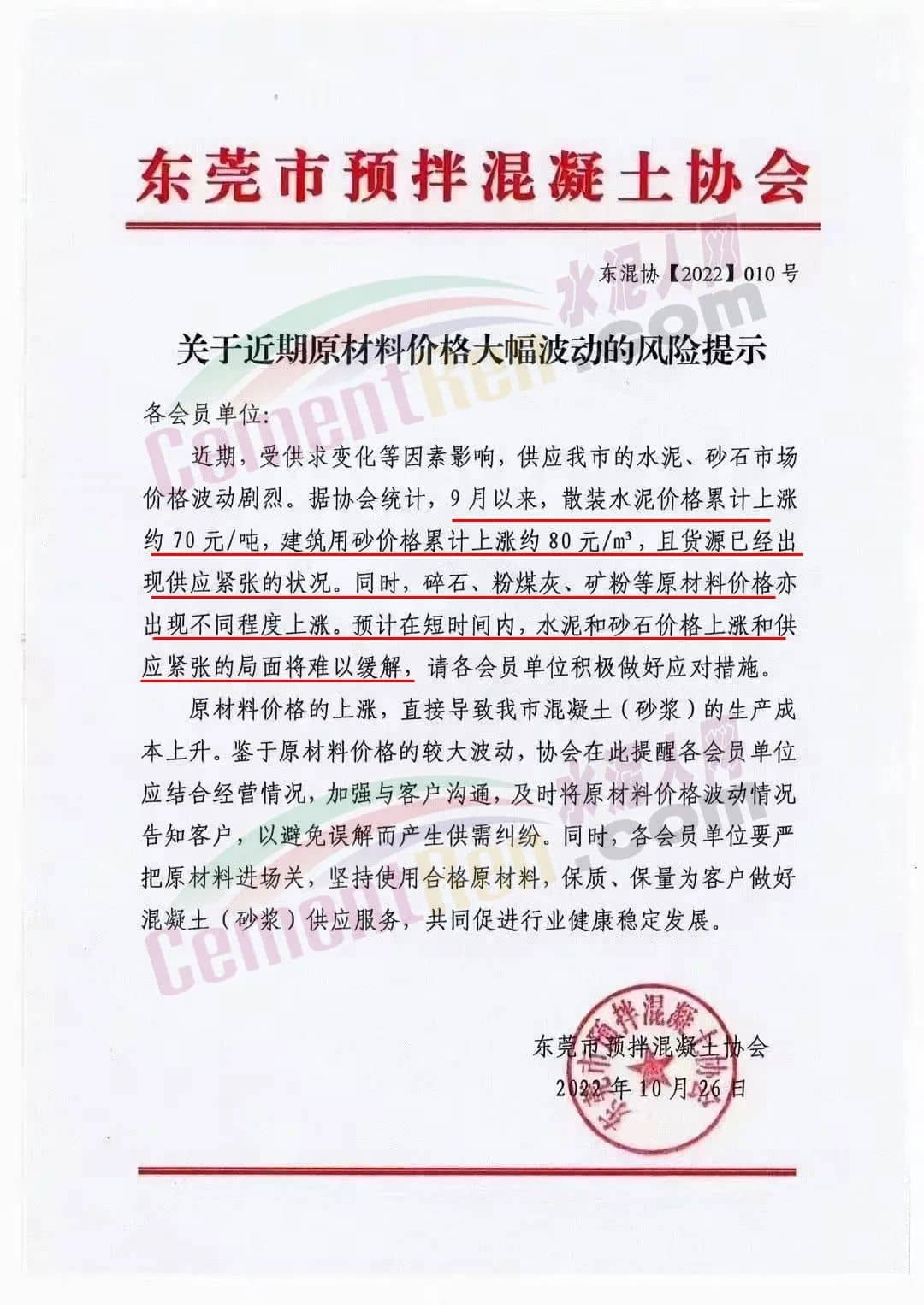 同期,廣東東莞市預(yù)拌混凝土協(xié)會(huì)發(fā)布《關(guān)于近期原材料價(jià)格大幅波動(dòng)的風(fēng)險(xiǎn)提示》稱近期,受供求變化等因素影響,供應(yīng)東莞市的水泥、砂石市場(chǎng)價(jià)格波動(dòng)劇烈。
