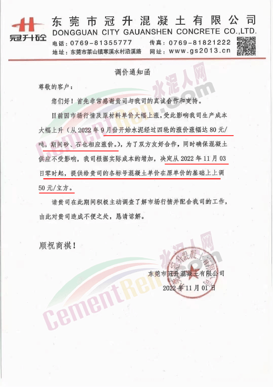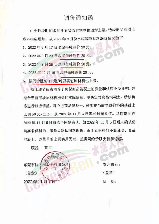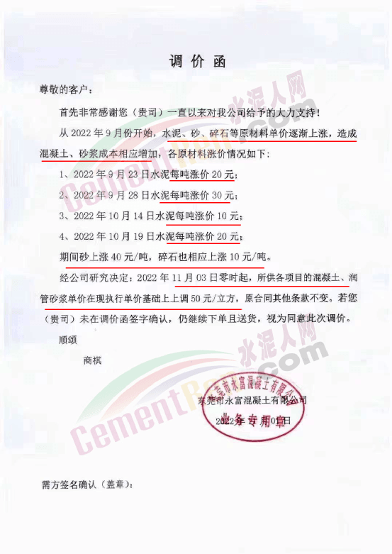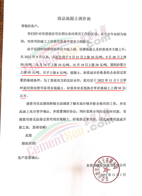 企業(yè)調(diào)價(jià)通知稱,從9月份開(kāi)始,水泥、砂石等原材料上漲,造成混凝土企業(yè)生產(chǎn)成本增加,其中水泥4輪連漲,累計(jì)上漲80元/噸,砂上漲40-50元/噸,碎石上漲8-10元/噸?;炷疗髽I(yè)所供各項(xiàng)目的混凝土、砂漿價(jià)格跟進(jìn)上調(diào)50元/噸。
