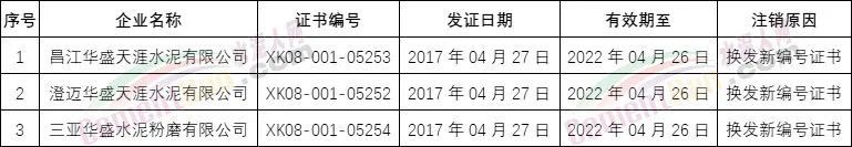 海南省3家水泥企業(yè)換發(fā)新編號證書,原證書注銷;