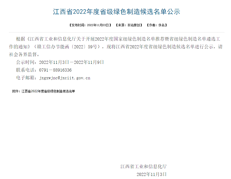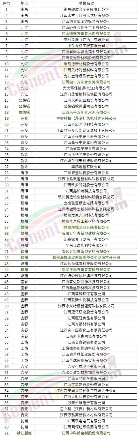 11月3日,江西省工信廳公布《2022年度省級綠色制造候選名單》71家綠色工廠名單中包括江西德安萬年青水泥有限公司、江西湖口萬年青水泥有限公司、江西樂平萬年青水泥有限公司、贛州海螺水泥有限責(zé)任公司、贛州海螺水泥有限責(zé)任公司龍南市分公司等5家水泥企業(yè)。