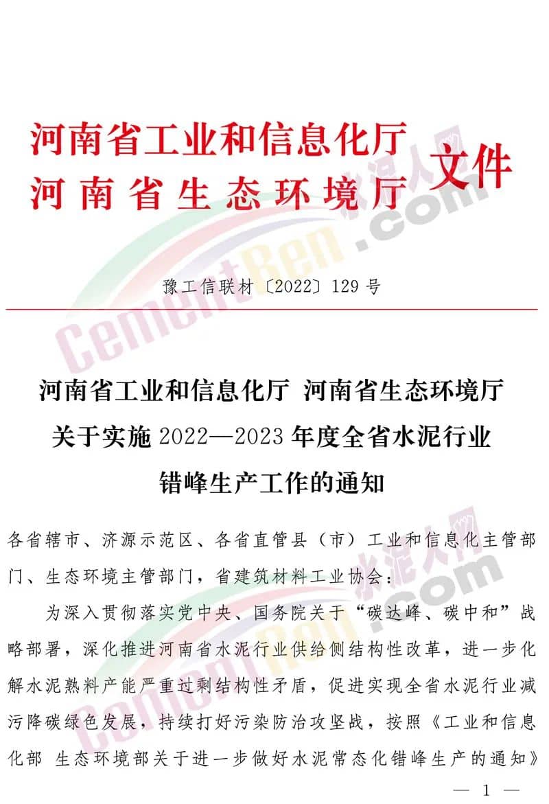 日前,河南工信廳、生態(tài)環(huán)境廳聯(lián)合發(fā)布《關(guān)于實施2022—2023年度全省水泥行業(yè)錯峰生產(chǎn)工作的通知》要求河南省內(nèi)所有水泥熟料生產(chǎn)線(不含水泥粉磨工序和粉磨站)自2022年11月15日至2023年3月15日采暖期期間,實施錯峰停產(chǎn)。