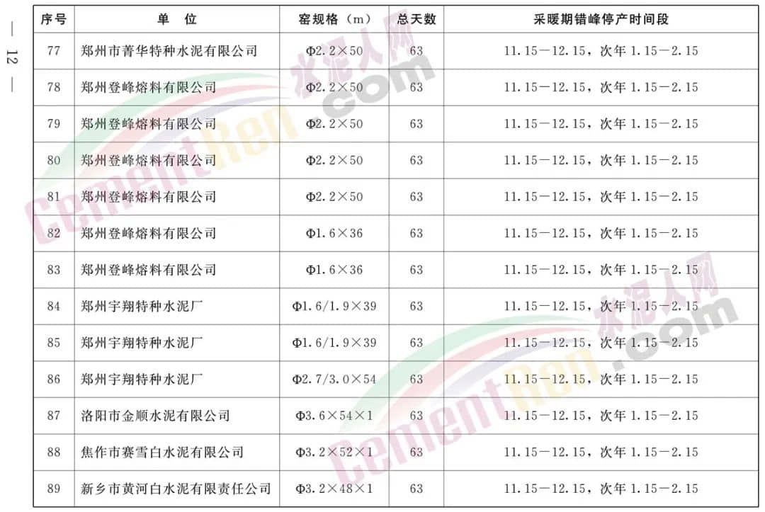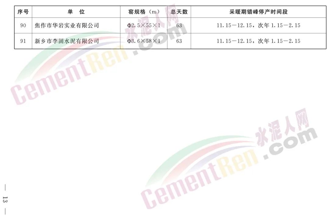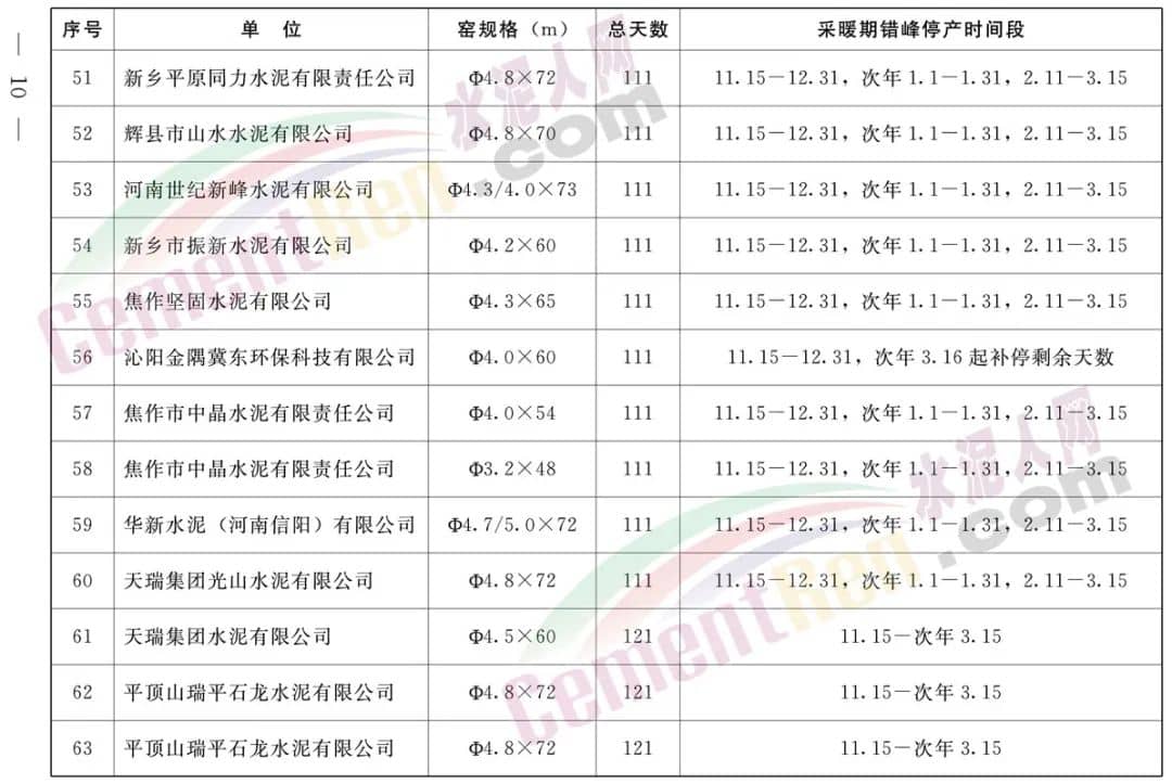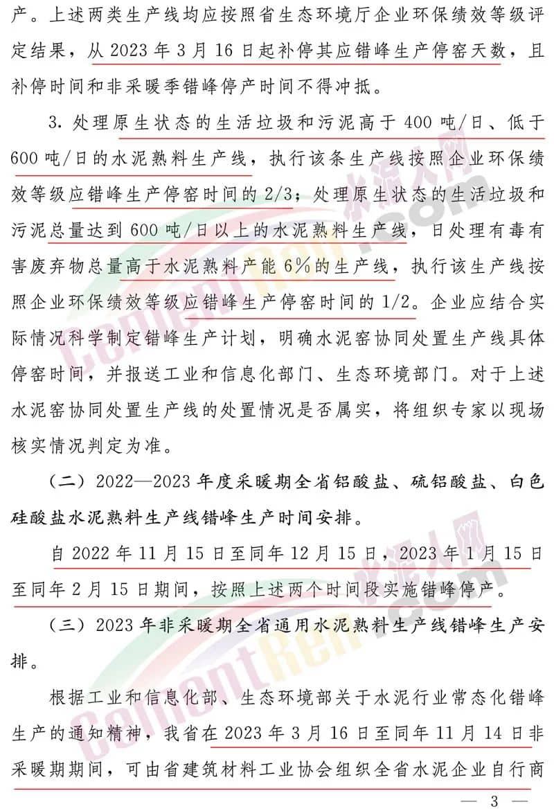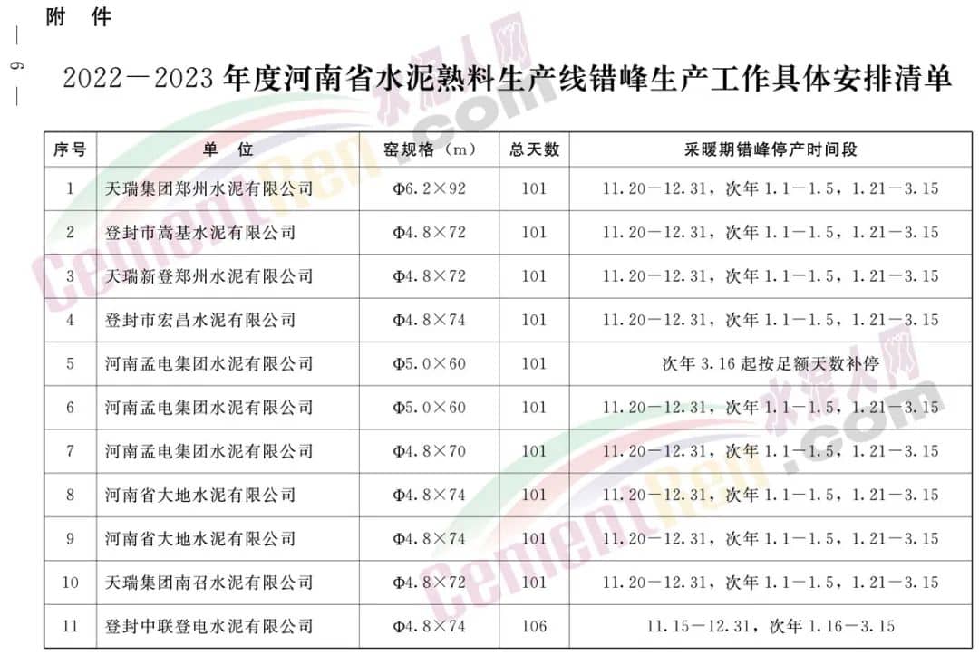 采暖期全省鋁酸鹽、硫鋁酸鹽、白色硅酸鹽水泥熟料生產(chǎn)線錯峰生產(chǎn)時間安排,自2022年11月15日至同年12月15日(31天),2023年1月15日至同年2月15日(32天)期間,按照上述兩個時間段實施錯峰停產(chǎn)。