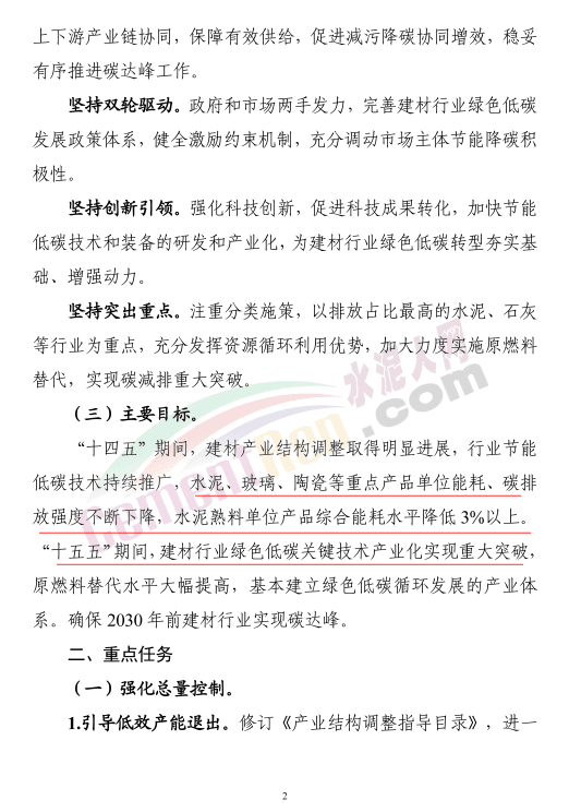 工業(yè)和信息化部、國家發(fā)展和改革委員會、生態(tài)環(huán)境部、住房和城鄉(xiāng)建設(shè)部等四部門聯(lián)合印發(fā)《建材行業(yè)碳達(dá)峰實施方案》,方案提出“十四五”期間,建材產(chǎn)業(yè)結(jié)構(gòu)調(diào)整取得明顯進(jìn)展,行業(yè)節(jié)能低碳技術(shù)持續(xù)推廣,水泥、玻璃、陶瓷等重點產(chǎn)品單位能耗、碳排放強(qiáng)度不斷下降,水泥熟料單位產(chǎn)品綜合能耗水平降低3%以上。“十五五”期間,建材行業(yè)綠色低碳關(guān)鍵技術(shù)產(chǎn)業(yè)化實現(xiàn)重大突破,原燃料替代水平大幅提高,基本建立綠色低碳循環(huán)發(fā)展的產(chǎn)業(yè)體系。確保2030年前建材行業(yè)實現(xiàn)碳達(dá)峰。