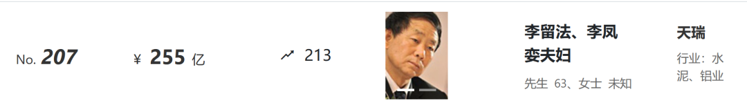 來自浙江的農(nóng)夫山泉創(chuàng)始人鐘睒睒,再次登上2022胡潤百富榜榜首,財富值達4550億元,創(chuàng)20多年來中國首富財富值最高紀(jì)錄。“水泥富豪天瑞集團的李留法、李鳳孌夫婦,以255億元財富位列207位;紅獅控股集團的章小華,以110億元的財富排名564位;臺泥的辜侯天儀家族以72億元財富位列894位。