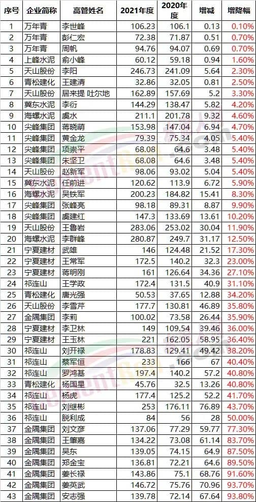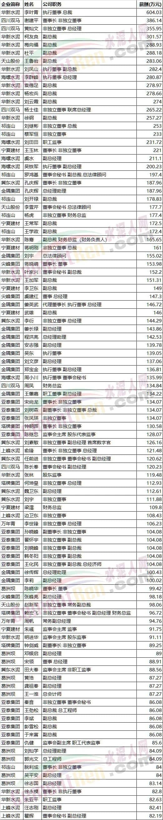 A股水泥板塊上市公司高管薪酬前100位