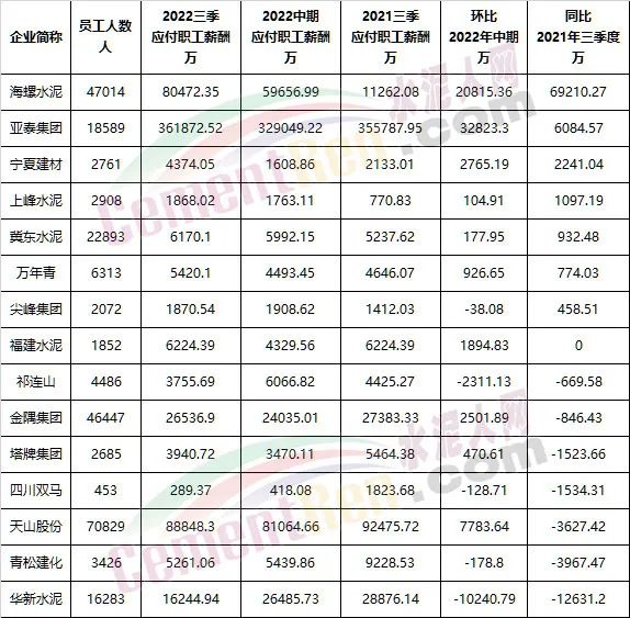 反觀水泥行業(yè)2022年前三季度利潤,絕大多數(shù)企業(yè)利潤大比例下滑。也意味著企業(yè)管理層與員工績效工資的下降。