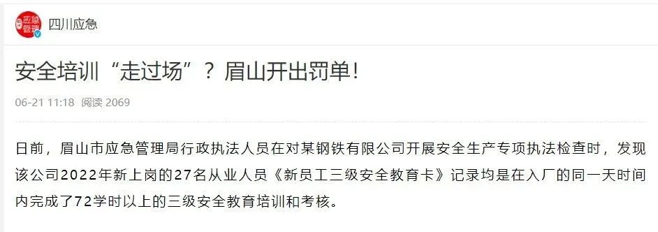 四川眉山市應(yīng)急管理局開(kāi)展安全生產(chǎn)專項(xiàng)執(zhí)法檢查時(shí),發(fā)現(xiàn)某公司2022年新上崗的27名從業(yè)人員《新員工三級(jí)安全教育卡》記錄均是在入廠的同一天時(shí)間內(nèi)完成了72學(xué)時(shí)以上的三級(jí)安全教育培訓(xùn)和考核。