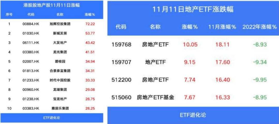 港股地產(chǎn)板塊漲幅驚人,旭輝控股漲72%,新城發(fā)展?jié)q超53%,龍光集團(tuán)漲超41%,碧桂園漲近35%;A股陽(yáng)光城、綠地控股、華發(fā)股份、新城控股、保利發(fā)展、廣宇集團(tuán)、萬(wàn)科A等多股漲停。房地產(chǎn)ETF漲幅達(dá)到10%,沖擊漲停板,地產(chǎn)ETF漲超9%,房地產(chǎn)ETF基金上漲7%。