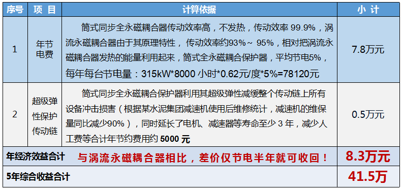 除上述性能優(yōu)勢外,江蘇磁谷同步永磁耦合器的應(yīng)用還能大大節(jié)約水泥企業(yè)生產(chǎn)成本,以原使用渦流永磁耦合器對比估算,按1臺套平均功率315kW,每年工作8000小時進(jìn)行測算,應(yīng)用江蘇磁谷同步永磁耦合器后預(yù)計每年可節(jié)約8.3萬元,產(chǎn)生的經(jīng)濟(jì)效益十分可觀。