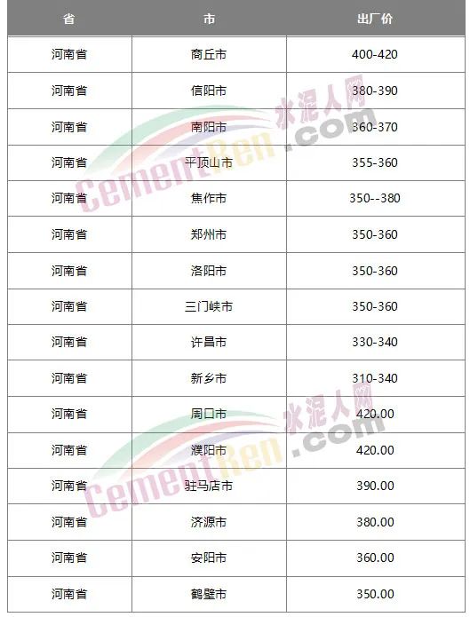 河南省內(nèi)各區(qū)域水泥出廠參考報(bào)價(jià)一覽