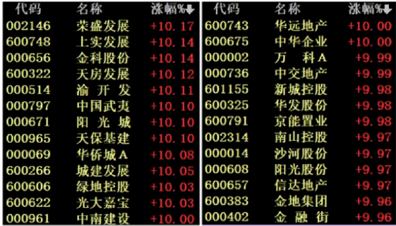 房地產(chǎn)板塊掀起“漲停潮”,中交地產(chǎn)、中國(guó)武夷4連板,天房發(fā)展、渝開(kāi)發(fā)、臥龍地產(chǎn)、空港股份、城建發(fā)展、光大嘉寶、中華企業(yè)、京能置業(yè)、沙河股份、世榮兆業(yè)、陽(yáng)光股份、信達(dá)地產(chǎn)、光明地產(chǎn)、深振業(yè)A、大龍地產(chǎn)、南國(guó)置業(yè)競(jìng)價(jià)漲停。港股方面,多只內(nèi)房股盤(pán)中漲超20%。
