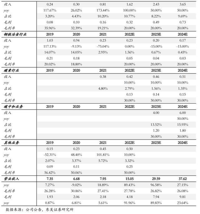 占總收入比重較小,假設(shè)鋼鐵行業(yè)2022-2024年收入增速為0%/-15%/-15%,假設(shè)碳素行業(yè)2022-2024年收入增速為10%/10%/10%,假設(shè)汽車(chē)制造、精細(xì)化工及其他行業(yè)2022-2024年收入增速維持10%左右增速,毛利率與過(guò)去三年趨勢(shì)保持一致