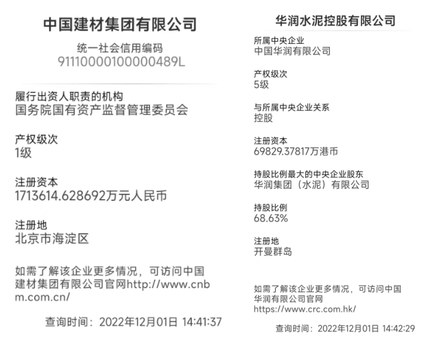 水泥人網(wǎng)通過(guò)查詢(xún)“中國(guó)建材集團(tuán)有限公司,華潤(rùn)水泥控股有限公司”了解到,中國(guó)建材集團(tuán)有限公司為國(guó)務(wù)院國(guó)有資產(chǎn)監(jiān)管管理委員會(huì)下屬1級(jí)產(chǎn)權(quán)企業(yè)。華潤(rùn)水泥控股有限公司為中央企業(yè)中國(guó)華潤(rùn)有限公司控股企業(yè),產(chǎn)權(quán)級(jí)次為“5級(jí)”。
