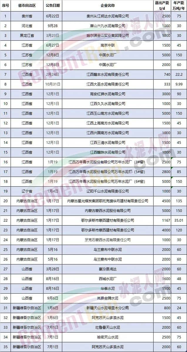 上述江蘇、江西、貴州、遼寧、黑龍江、河北、山西、內(nèi)蒙古、新疆等9個(gè)省市自治區(qū)拆除退出用于產(chǎn)能置換的35條熟料生產(chǎn)線,合計(jì)退出產(chǎn)能2264.2萬噸/年。