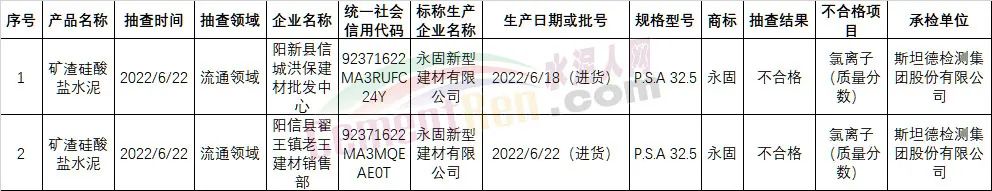 山東省濱州流通領域抽檢同一家企業(yè)兩批次水泥氯離子不合格