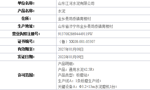 山東江河水泥有限公司生產(chǎn)許可證編號(魯)XK08-001-05307,有效期至2027年1月8日,企業(yè)類型為粉磨站;企業(yè)擁有1條粉磨生產(chǎn)線;關鍵設備為Φ3.2×13m水泥磨機1臺;企業(yè)“恒誠”商標已注冊。