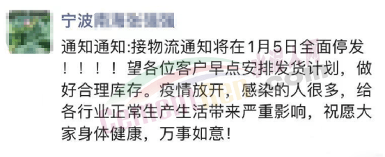 寧波一企業(yè)通知稱:接物流通知將在1月5日全面停發(fā)。望各位客戶早點(diǎn)安排發(fā)貨計(jì)劃,做好合理庫存。疫情放開,感染的人很多,給各行業(yè)正常生產(chǎn)、生活帶來嚴(yán)重影響。