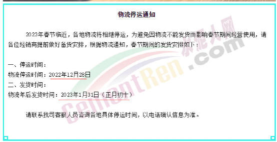 據(jù)水泥人網(wǎng)了解,目前已有多家物流公司發(fā)布春節(jié)停運(yùn)的通知。受大多物流公司停運(yùn)影響,各行各業(yè)產(chǎn)業(yè)鏈的運(yùn)行均受到一定的影響,相繼出現(xiàn)發(fā)貨困難、配套供應(yīng)緊缺及生產(chǎn)任務(wù)加重的問題。