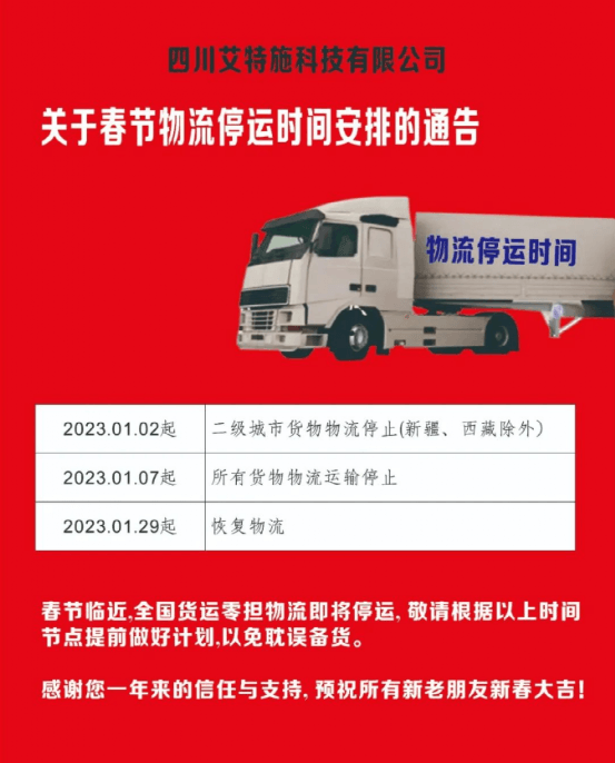 四川艾特施科技通知,2023年1月2日起二級(jí)城市貨物物流停止(新疆、西藏除外)。2023年1月7日起所有貨物物流運(yùn)輸停止。2023年1月29日起,恢復(fù)物流。