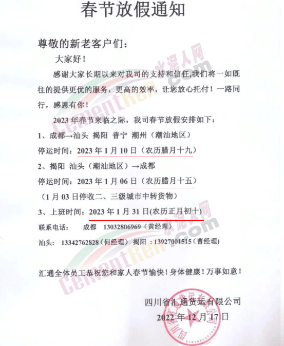 四川省匯通貨運(yùn)有限公司:成都→汕頭揭陽普寧潮州(潮汕地區(qū))停運(yùn)時(shí)間:2023年1月10日(農(nóng)歷臘月十九)揭陽汕頭(潮汕地區(qū))→成都。停運(yùn)時(shí)間:2023年1月06日(農(nóng)歷臘月十五)。1月03日停收二、三級(jí)城市中轉(zhuǎn)貨物。上班時(shí)間:2023年1月31日(農(nóng)歷正月初十)