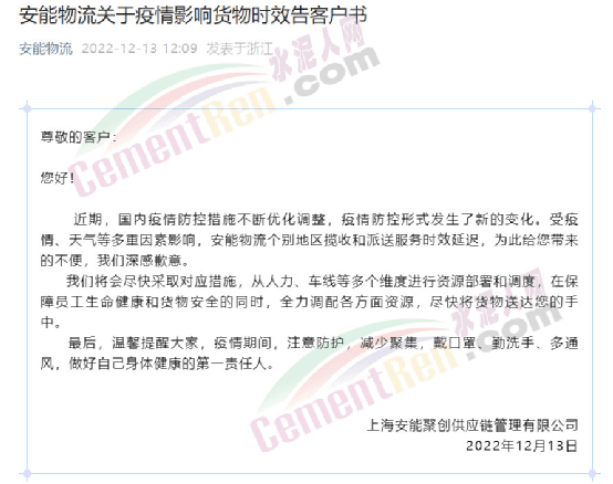 上海安能聚創(chuàng)供應(yīng)鏈管理有限公司通知稱,近期,國內(nèi)疫情防控措施不斷優(yōu)化調(diào)整,疫情防控形勢發(fā)生了新的變化。受疫情、天氣等多重因素影響,安能物流個(gè)別地區(qū)攬收和派送服務(wù)時(shí)效延遲。
