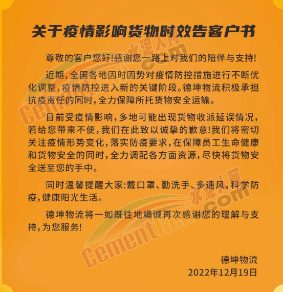 德坤物流關(guān)于疫情影響貨物時(shí)效告客戶書稱,近期,全國各地因時(shí)因勢對(duì)疫情防控措施進(jìn)行不斷優(yōu)化調(diào)整,疫情防控進(jìn)入新的關(guān)鍵階段,疫情影響,多地可能出現(xiàn)貨物收派延誤情況,德坤物流積極承擔(dān)抗疫責(zé)任的同時(shí),全力保障所托貨物安全運(yùn)輸。