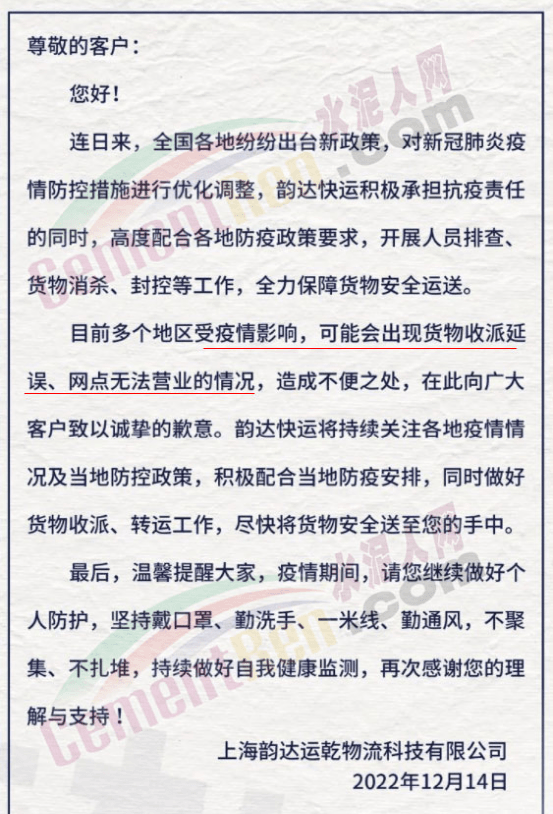 上海韻達(dá)運(yùn)乾物流科技有限公司通知,連日來,全國各地紛紛出臺(tái)新政策,對(duì)新冠肺炎疫情防控措施進(jìn)行優(yōu)化調(diào)整,目前多個(gè)地區(qū)受疫情影響,可能會(huì)出現(xiàn)貨物收派延誤、網(wǎng)點(diǎn)無法營業(yè)的情況,造成不便之處,在此向廣大客戶致以誠摯的歉意。