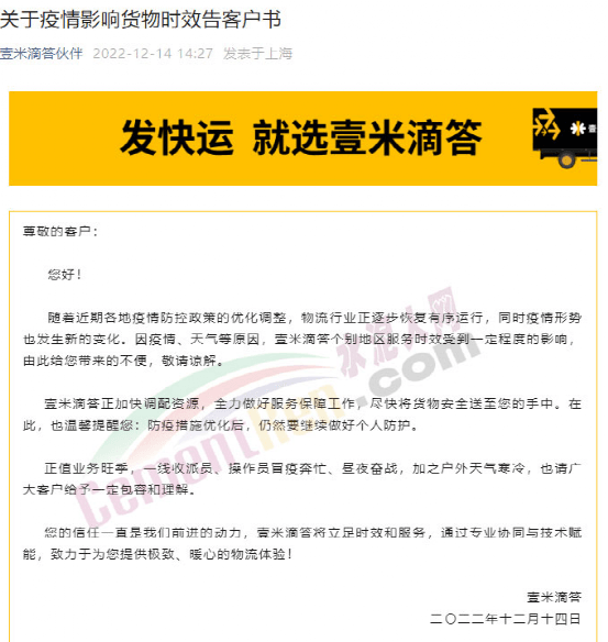 壹米滴答通知,隨著近期各地疫情防控政策的優(yōu)化調(diào)整,物流行業(yè)正逐步恢復(fù)有序運(yùn)行,同時(shí)疫情形勢也發(fā)生新的變化。因疫情、天氣等原因,壹米滴答個(gè)別地區(qū)服務(wù)時(shí)效受到一定程度的影響。
