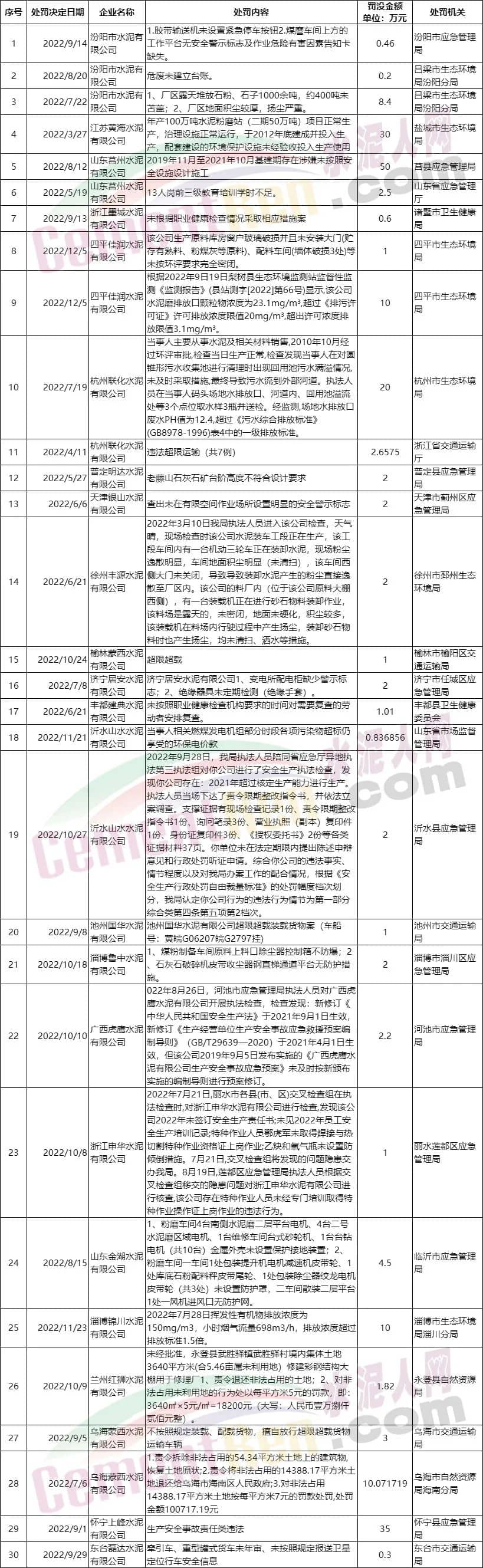 按照國務院安委會統(tǒng)一部署,從即日起至2023年全國“兩會”結束。同時各地生態(tài)環(huán)境、市場監(jiān)管、自然資源、交通運輸、衛(wèi)生健康部門對于工貿(mào)領域的檢查也呈常態(tài)化。水泥人網(wǎng)特將年內(nèi)各區(qū)域公開處罰的部分水泥企業(yè)及相關處罰原因,匯總如下,以提醒相關企業(yè)引起重視。