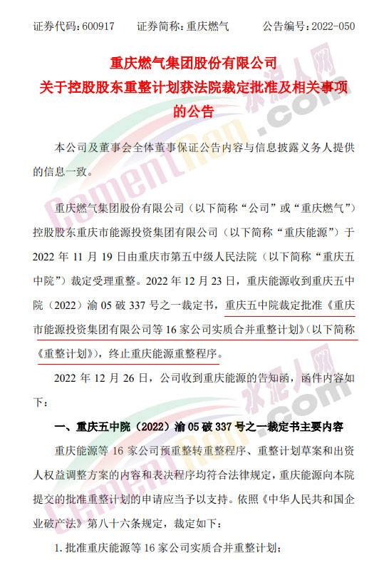 近日,重慶燃?xì)獍l(fā)布公告稱,重慶五中院裁定批準(zhǔn)公司控股股東重慶能源等16家公司實(shí)質(zhì)合并重整計(jì)劃,終止重慶能源重整程序。重慶能源持有的公司股份6.45億股,將在法院裁定批準(zhǔn)重整計(jì)劃6個(gè)月內(nèi)抵償給相應(yīng)債權(quán)人。
