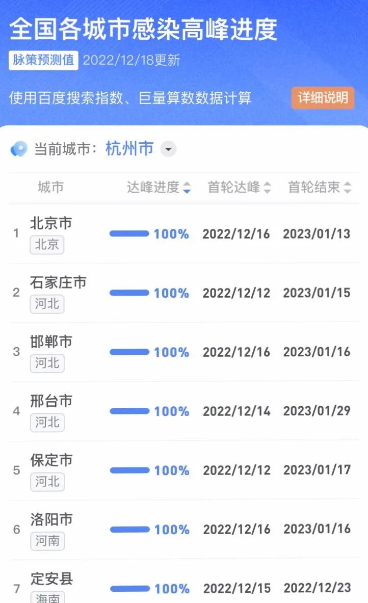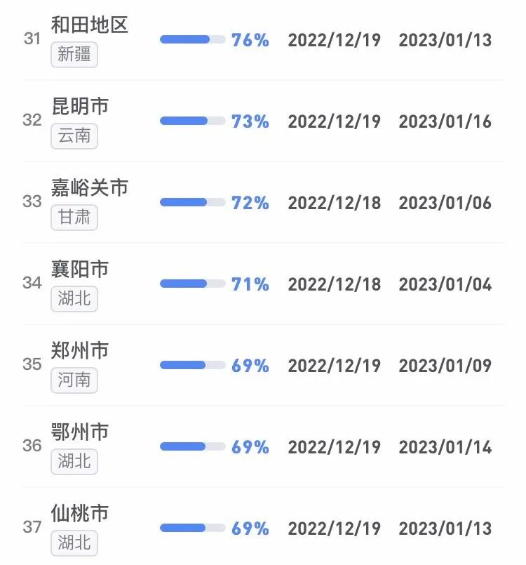據(jù)不完全統(tǒng)計,全國感染進度100%的城市已累計達17個,其中石家莊市、保定市、甘南藏族自治州、克孜勒蘇柯爾克孜自治州均在12日就達到首輪感染峰值。成都市、武漢市等76個市達峰進度已超過50%。
