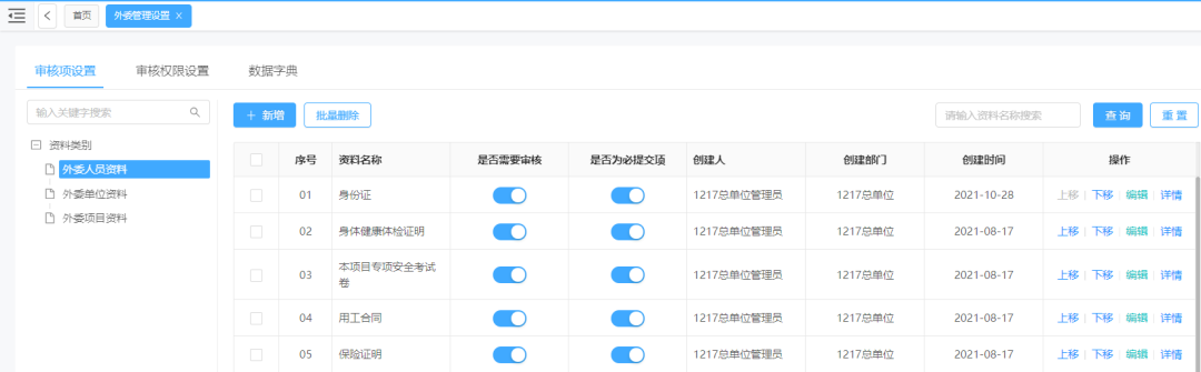 2.水泥企業(yè)管理人員可在平臺(tái)進(jìn)行相關(guān)方管理,設(shè)置相關(guān)方項(xiàng)目、單位及人員分別需提交的資料及審核內(nèi)容作為準(zhǔn)入條件,相關(guān)方單位資質(zhì)及人員審核通過才能被錄入平臺(tái),審核不通過則系統(tǒng)自動(dòng)研判為不具備準(zhǔn)入條件,相關(guān)方單位及人員則無法入廠。