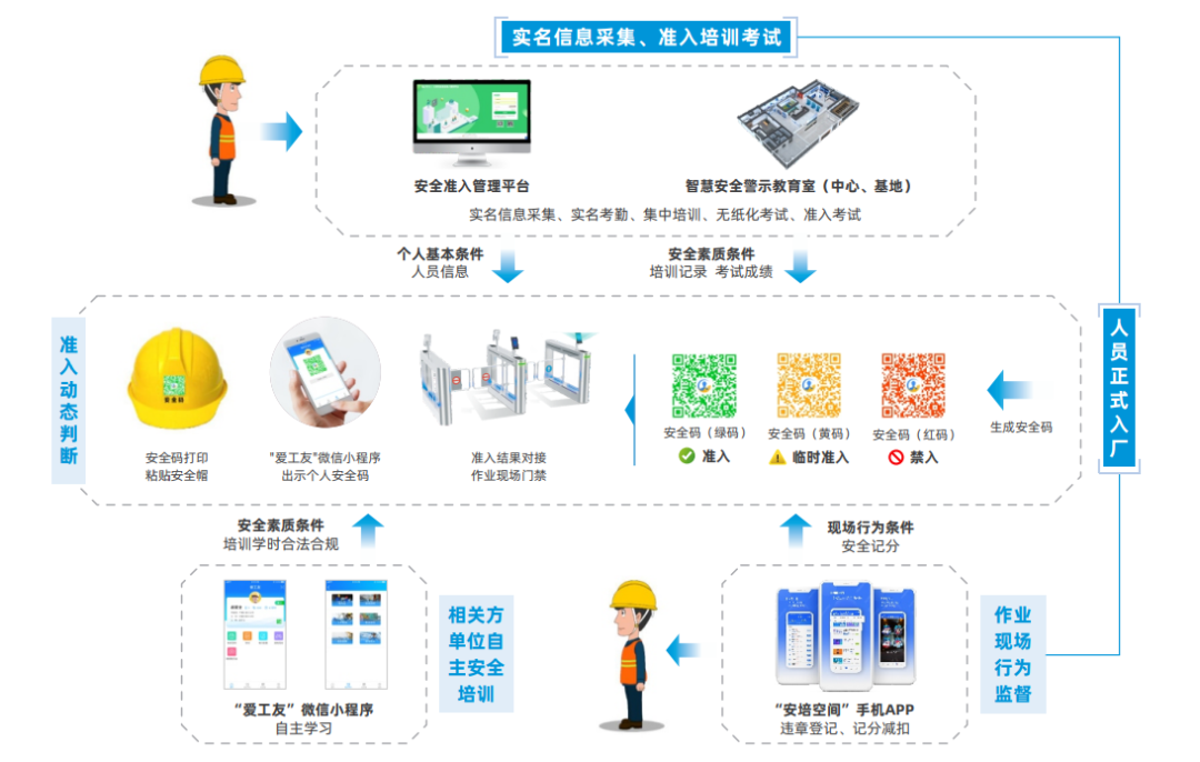 以水泥企業(yè)相關(guān)方人員“個(gè)人基本條件+安全素質(zhì)條件+現(xiàn)場行為條件”為依據(jù),綜合研判相關(guān)方人員準(zhǔn)入狀態(tài),生成安全碼,人因風(fēng)險(xiǎn)等級(jí)可視化。同時(shí)通過智慧安全警示教育室、安全準(zhǔn)入管理平臺(tái)、“愛工友”微信小程序等用于人員信息采集、準(zhǔn)入培訓(xùn)考核、作業(yè)行為監(jiān)督,嚴(yán)控相關(guān)方人員安全準(zhǔn)入,降低人因安全風(fēng)險(xiǎn),減少安全事故的發(fā)生。
