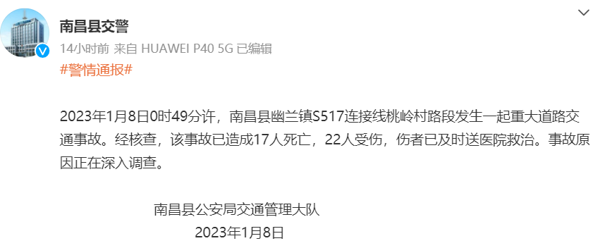 當?shù)鼐用裉峁┑墓俜酵▓蠓Q,2023年1月8日0時50分,在南昌縣幽蘭鎮(zhèn)桃?guī)X村紅溪章家自然村發(fā)生一起重大交通事故,一輛重型半掛牽引車(屬于樂平某物流公司),撞上出殯隊伍,初步掌握,事故已造成17人死亡、22人受傷,傷者已送往醫(yī)院搶救,車輛核載質(zhì)量32700KG,車輛裝載砂石。