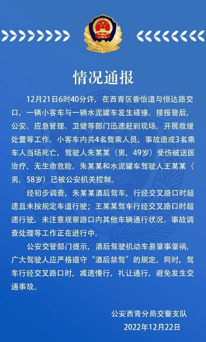 2022年12月21日,天津發(fā)生了一起水泥罐車與小客車碰撞的嚴重交通事故,造成了3人當場死亡。當?shù)鼐皆谕▓笾刑岬搅藘蓚€致命的細節(jié):第一,小客車的駕駛?cè)酥炷衬尘坪篑{車,行駛至交叉路口時超速且不按規(guī)定車道行駛;第二,水泥罐車駕駛?cè)送跄衬承薪?jīng)交叉路口時超速行駛,未注意觀察路口內(nèi)其他車輛通行狀況。