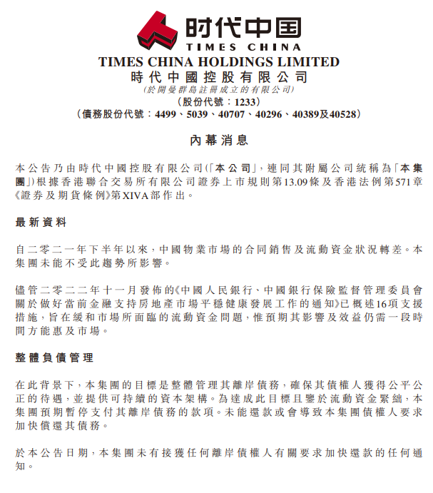 時(shí)代中國(guó)表示“深受2021年下半年以來(lái),房地產(chǎn)銷售轉(zhuǎn)差的嚴(yán)重影響。公司的整體資金緊張,無(wú)法公平支付整體的離岸債,所以公司將整體暫停所有離岸債的支付”。這是時(shí)代中國(guó)第一次以官方公告的方式,承認(rèn)自己無(wú)力支付債務(wù),也就是公開債務(wù)爆雷了。