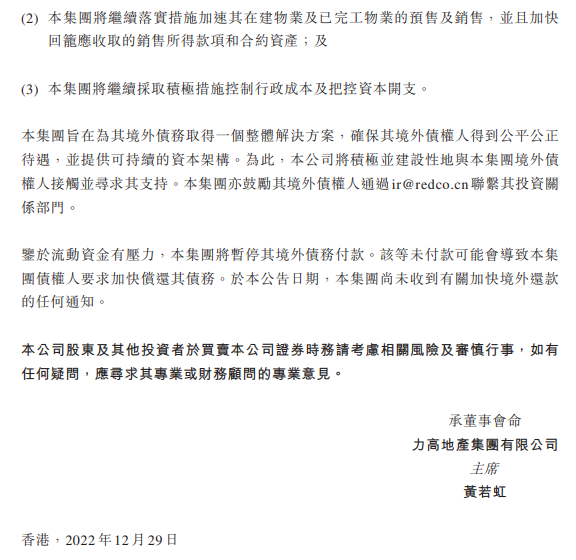 另一家,多年位列中國(guó)地產(chǎn)TOP100的力高集團(tuán),也在2022年的最后一個(gè)工作日發(fā)布公告,鑒于流動(dòng)資金有壓力,將暫停境外債務(wù)付款。公司將盡最大的努力保證正常運(yùn)營(yíng)及交樓。
