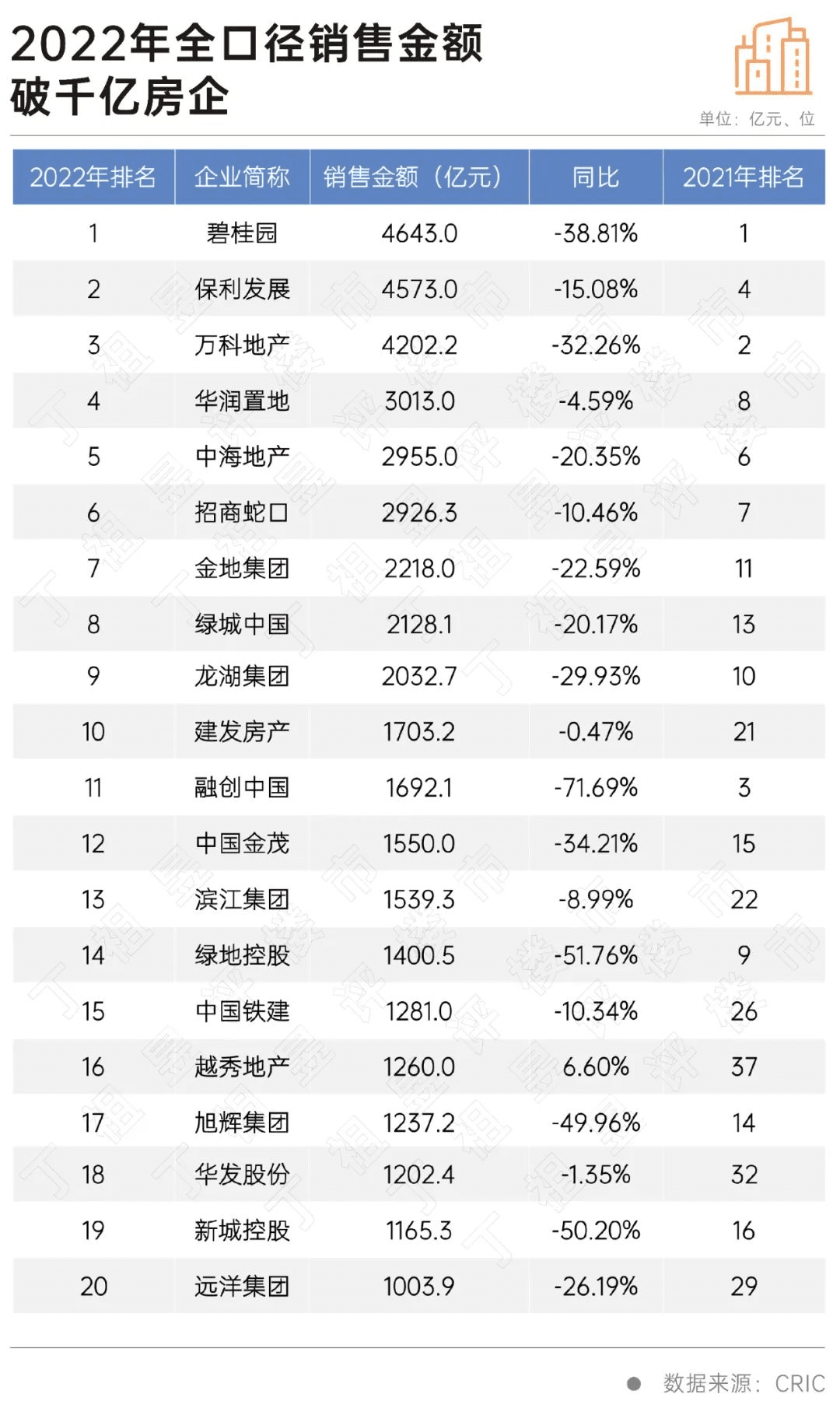 據(jù)水泥人網(wǎng)了解,2022年,多數(shù)規(guī)模房企深陷負(fù)增長(zhǎng)困局,百?gòu)?qiáng)房企全年業(yè)績(jī)有九成下滑。2022年成為房企洗牌年,最明顯的標(biāo)志是,千億房企數(shù)量銳減一半。